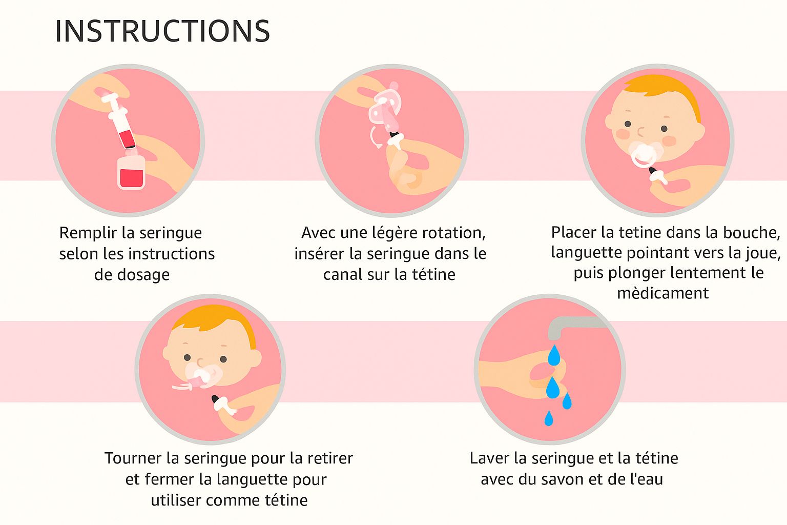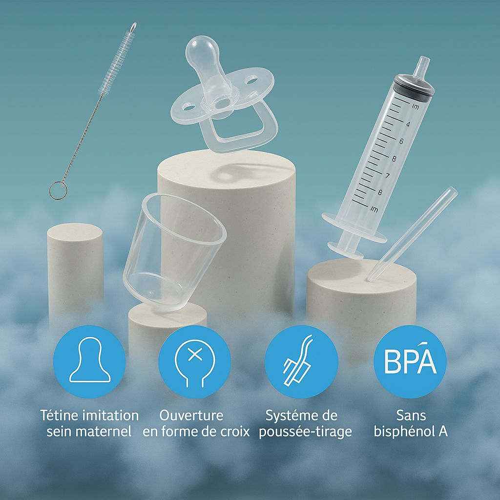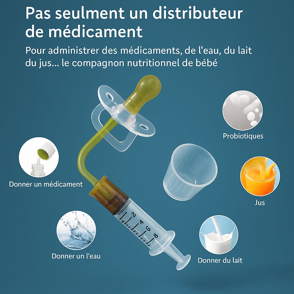 Offrez à votre bébé une solution douce, sûre et pratique pour l'administration de médicaments, d'eau, de lait ou de jus. Ce set complet comprend une tétine à imitation du sein maternel, une seringue graduée, un gobelet doseur, un tuyau de raccordement, une brosse de nettoyage et un étui de rangement.